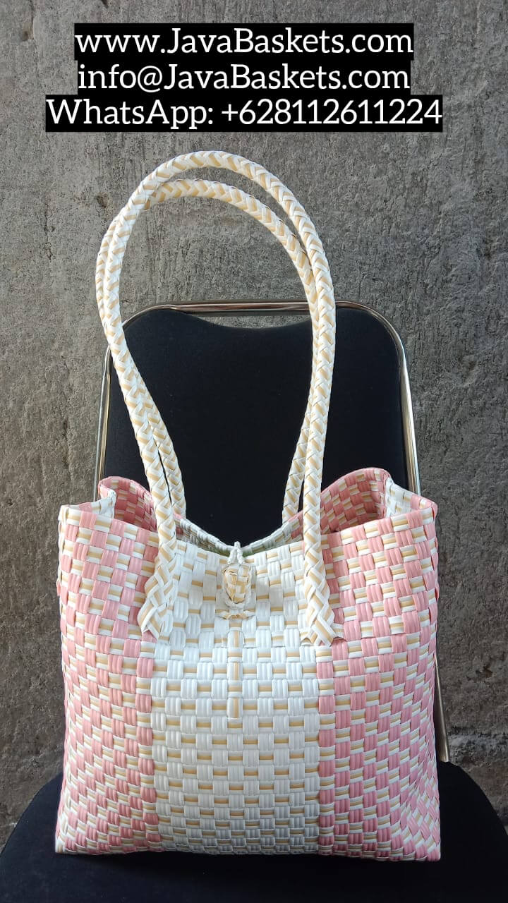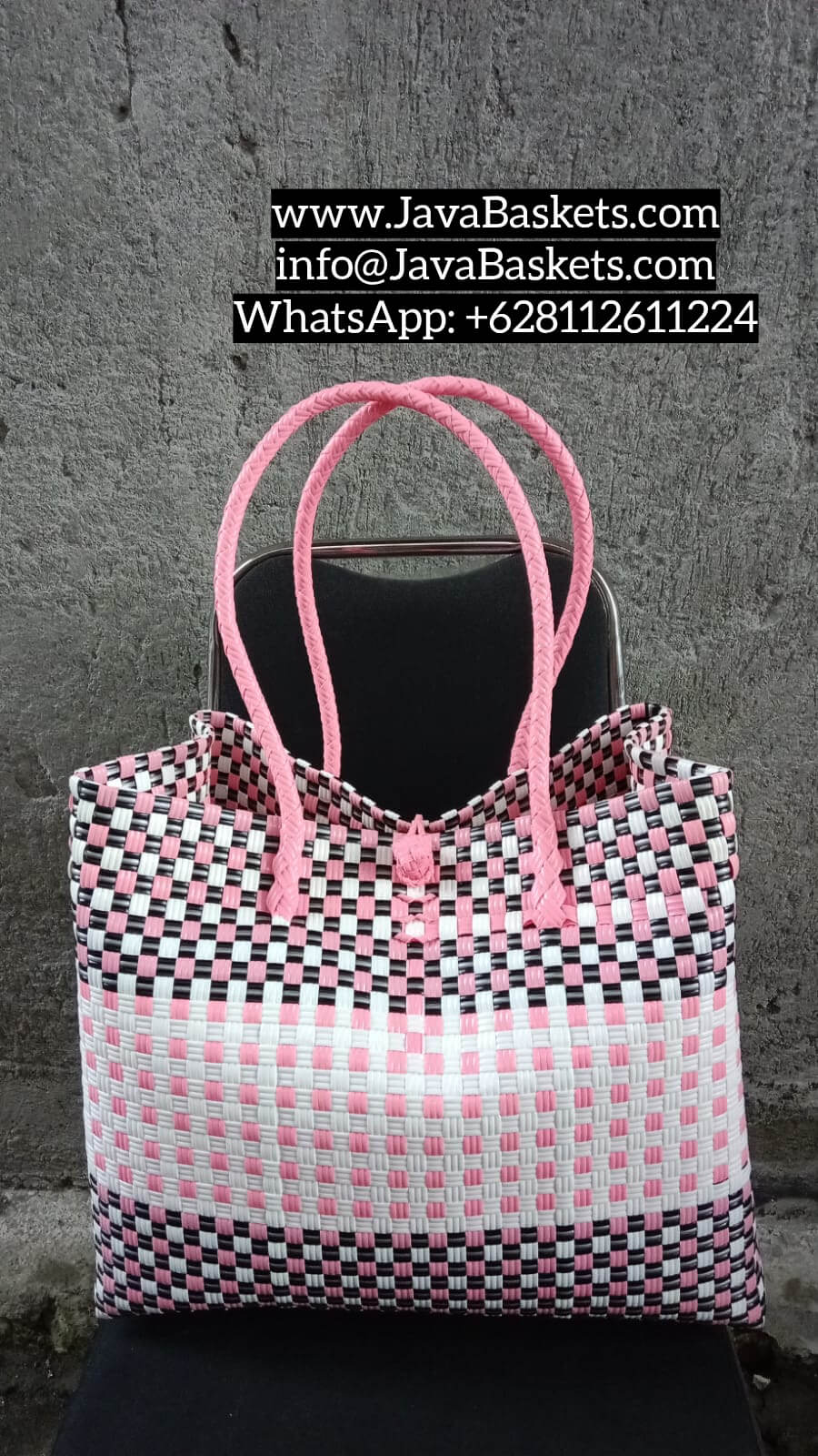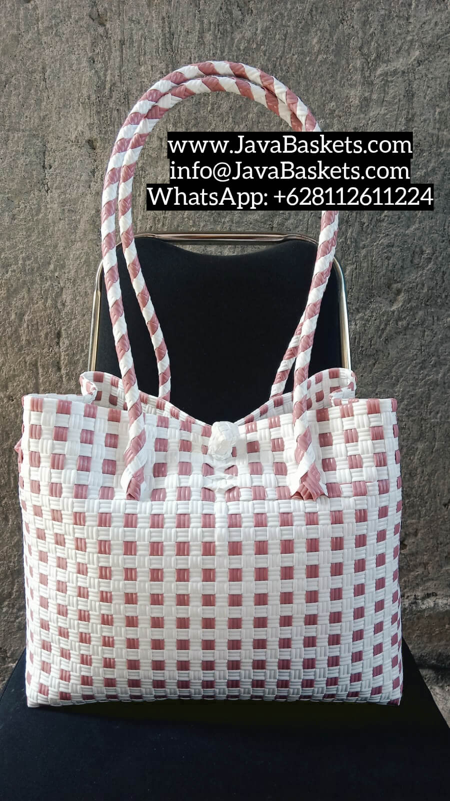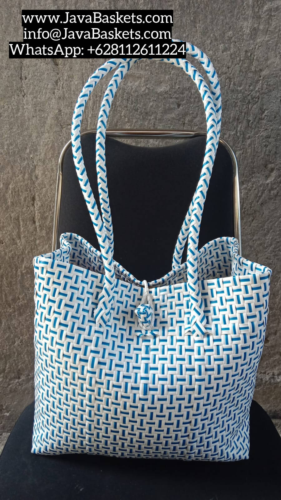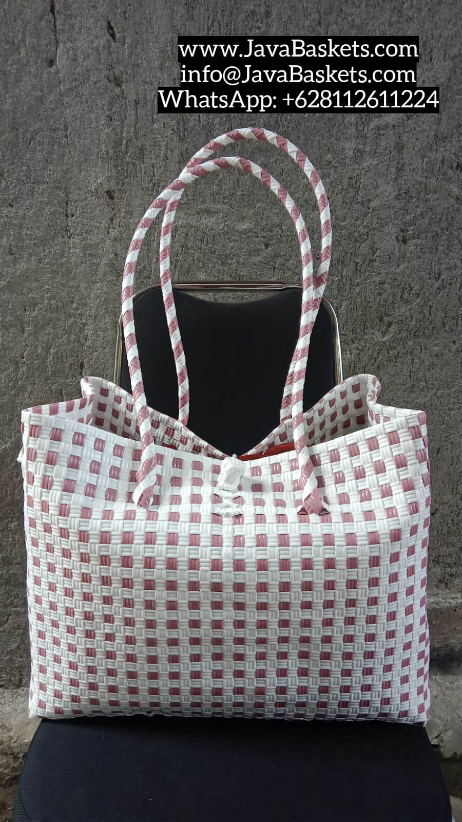 Market bags which very popular in Bali Indonesia. Durable and water proof. Suitable for you who need durable market bags, washable and waterproof. These bags are made using strapping bands, any color is possible. Made by hand using very simple tools. Handmade by traditional people living in remote villages in Java Indonesia. Your order for these recycled plastic shopping baskets made in Indonesia help us provide jobs for many housewives in remote region of Java Island in Indonesia.
