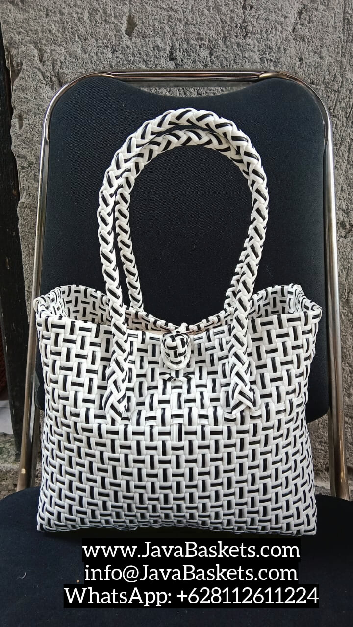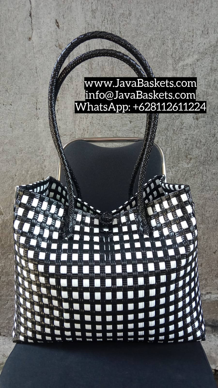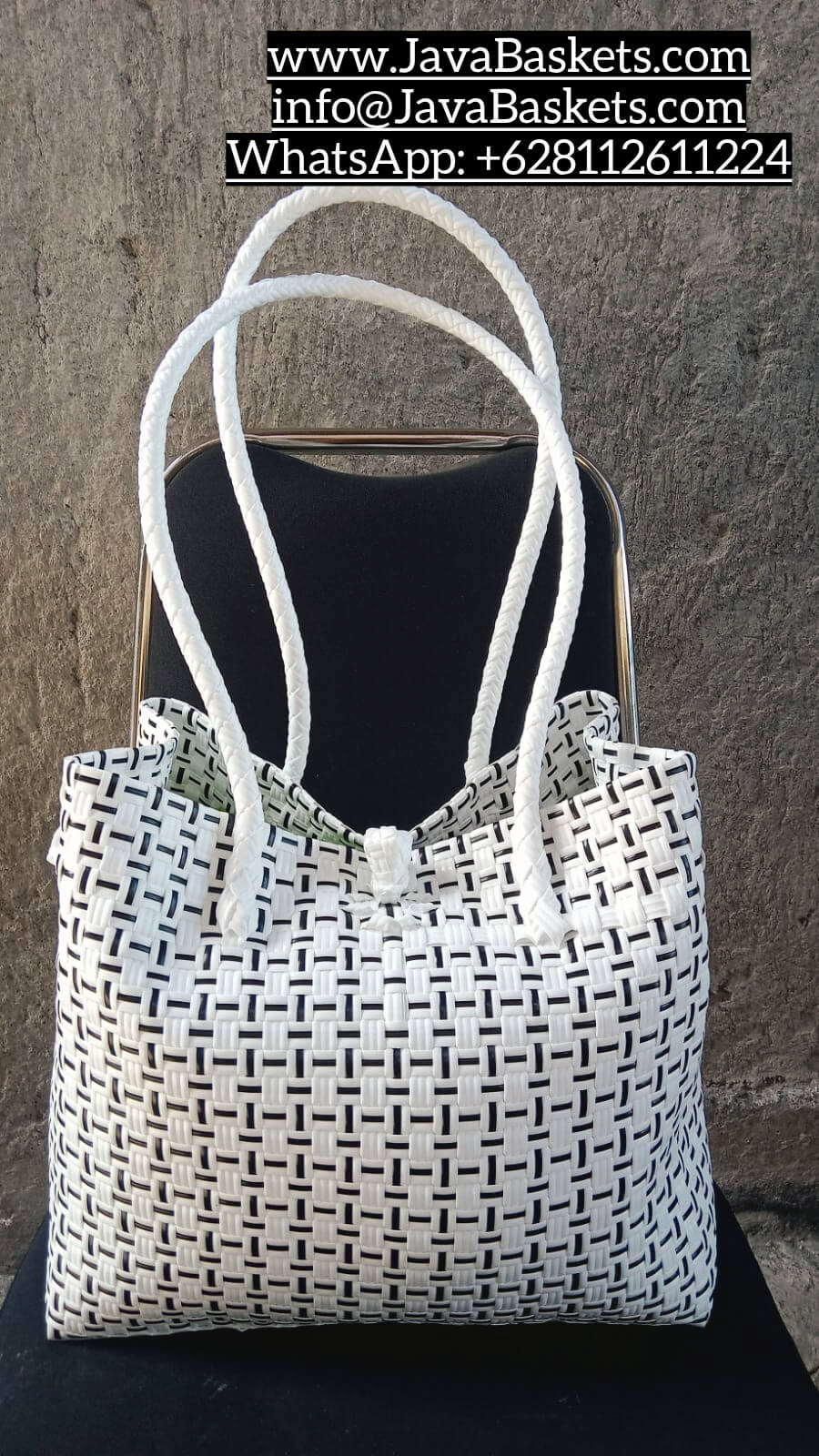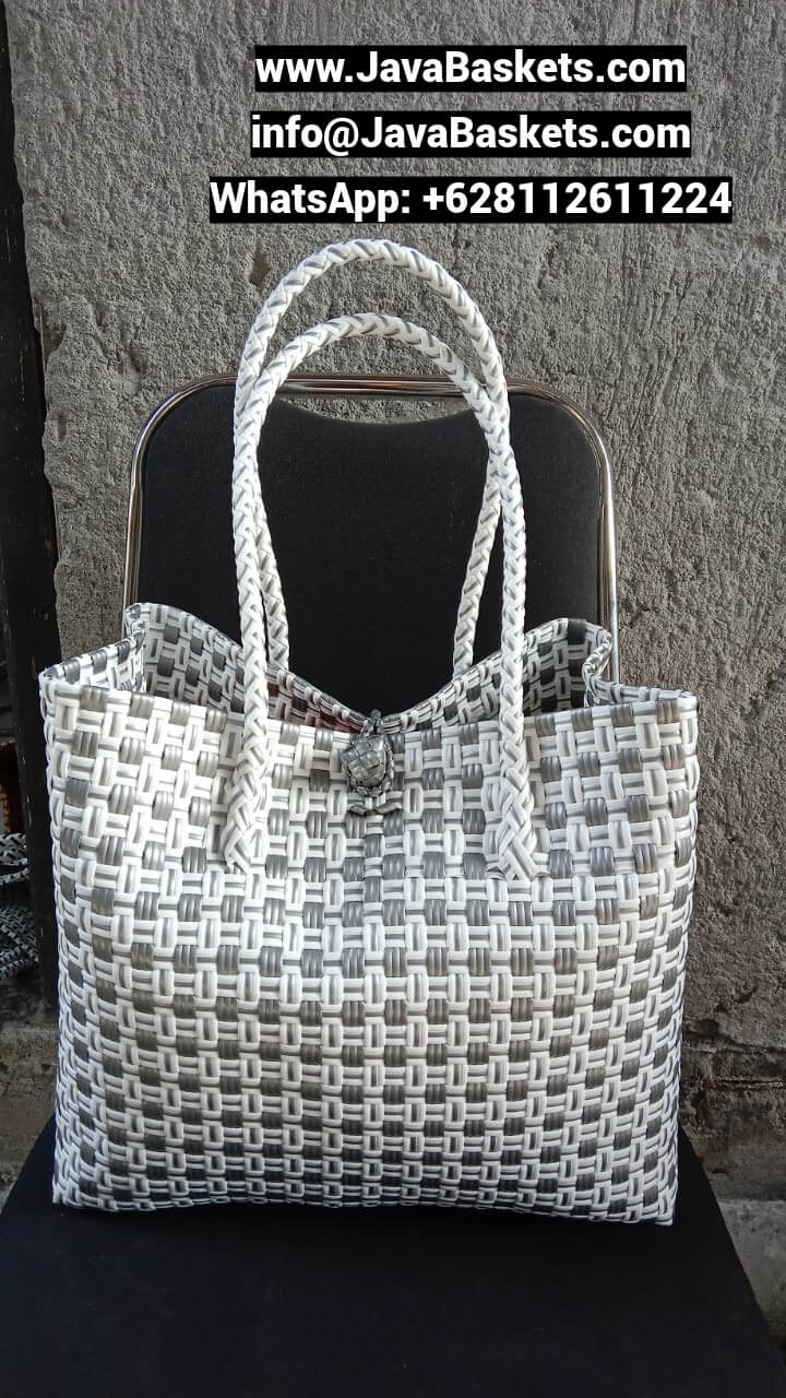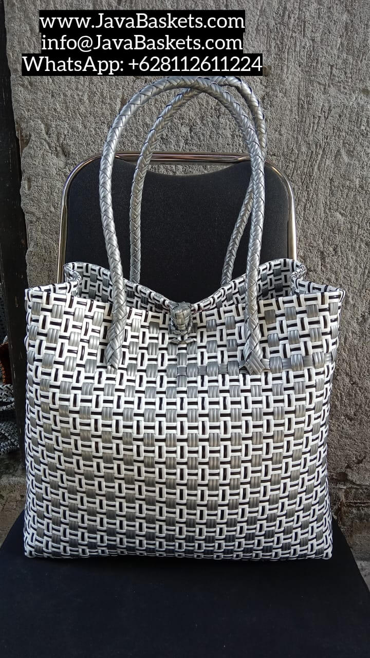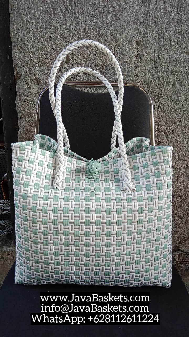 Market bags which very popular in Bali Indonesia. Durable and water proof. Suitable for you who need durable market bags, washable and waterproof. These bags are made using strapping bands, any color is possible. Made by hand using very simple tools. Handmade by traditional people living in remote villages in Java Indonesia. Your order for these recycled plastic shopping baskets made in Indonesia help us provide jobs for many housewives in remote region of Java Island in Indonesia.