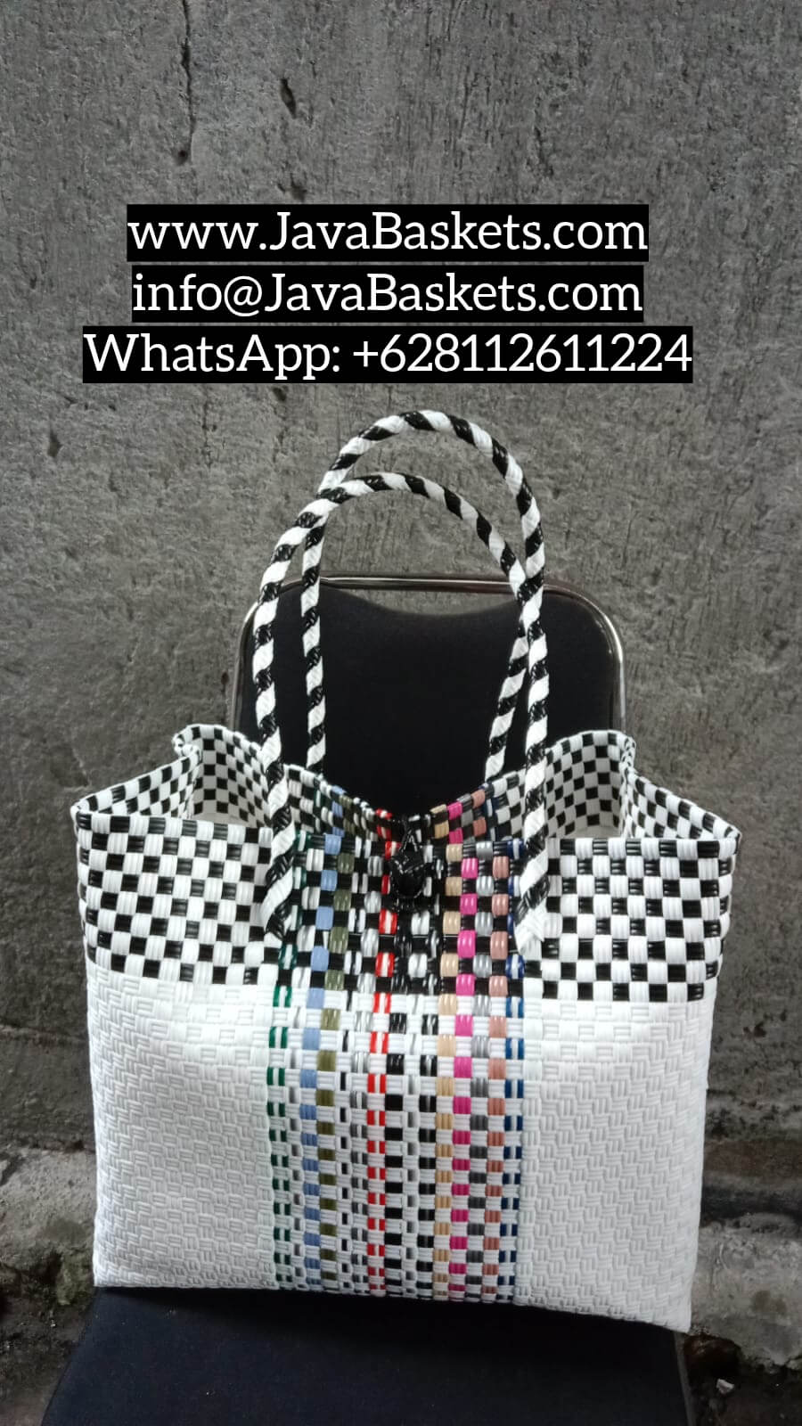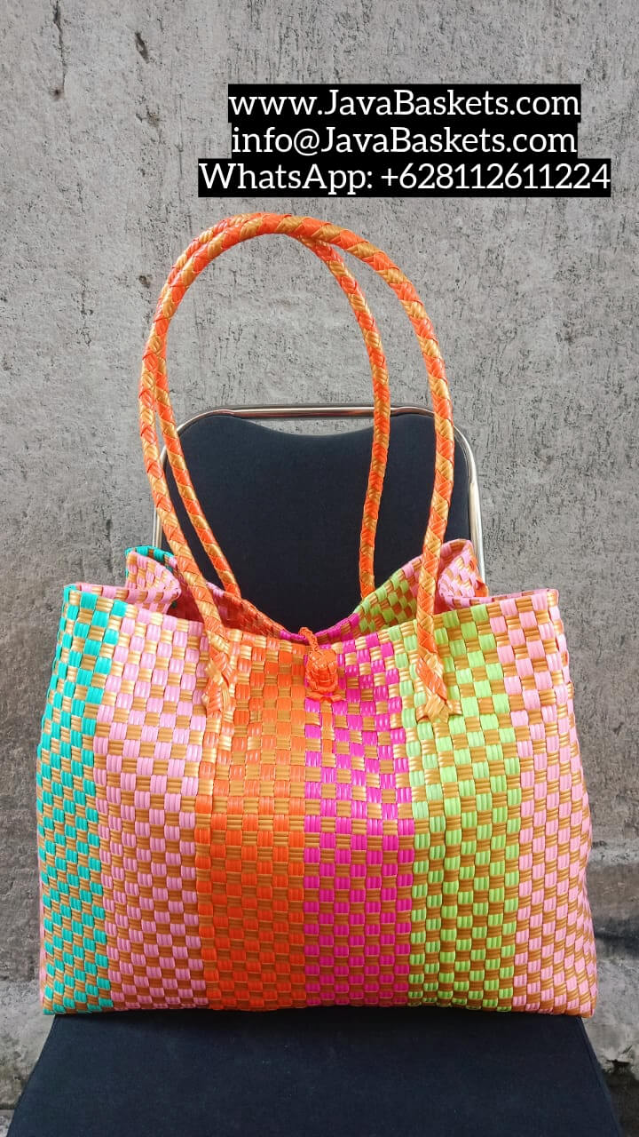 Bali recycled plastic shopping bags. Handcrafted recycled plastic totes, colourful woven bags, Balinese handbags and beach totes perfect for summer, market trips, and everyday eco style. Handwoven by skilled basket weavers in Java. Direct from artisans. Bulk quantity wholesale purchase of recycled plastic market bags direct from factory in Indonesia. To order, please send email to our email address or chat on WhatsApp. See photo for our contact details.